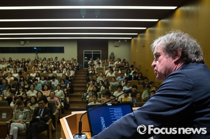 (서울=포커스뉴스) 인천공항을 설계했던 프랑스 건축가 장 미셸 빌모트가 21일 오후 서울 종로구 교보빌딩 컨벤션 홀에서 '토탈 디자인'을 주제로 강연하고 있다.