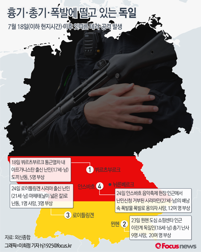 (서울=포커스뉴스) 최근 10일 간 독일에서 난민이나 이민자 출신이 저지른 인명 폭력 행위가 4차례에 이르자 독일 시민들의 치안에 대한 공포감이 증폭되고 있다.